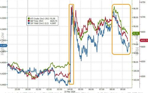 Key Events This Week: PMIs, Productivity And Consumer Sentiment As has become customary for Monday, we have seen a dramatic surge in risk assets (3rd Monday in a row) on what at least superficially appears to be de-escalation after Trump announced strikes against Iran’s power plant would be delayed by 5 days as a result of talks with Iran, talks which at least Iran’s domestic news sources have so far denied. And the market lurches […]